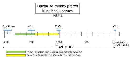 Samay rēkha Abrāham sē ārambh hōtī hai. Usē usakē vanś mēin sē jātiyōn kī ēk pratigya dī gaī thī aur usakī muthabhēd Paramēśvar kō usakē putr Isahāk kē pratīkātmak balidān kē sāth ant hōtī hai. Yah balidān Yīśu (Yīśu Satsang) kī ōr sankēt karata hua ēk chinh bhaviśy kē us sthān kō chinhit karatē huē tha jahān par usaka balidān hōga. Isahāk kē putr ka nām Paramēśvar kē dvāra Israēl rakha gaya. Yah samay rēkha harē rang mēin āgē badhatī hai jab Israēl kī santān kō Misr mēin dāsatv kē bandhan mēin āī thī. Yah avadhi us samay ārambh hōtī hai, jab Israēl ka putr Yūsuph (vanśāvalī yah thī: Abrāham -> Isahāk -> Israēl (jisē Yākūb bhī jāna gaya tha) -> Yūsuph), Israēliyōn kō Misr mēin lē gaya, jab vē lōg bād mēin dās ban gaē.